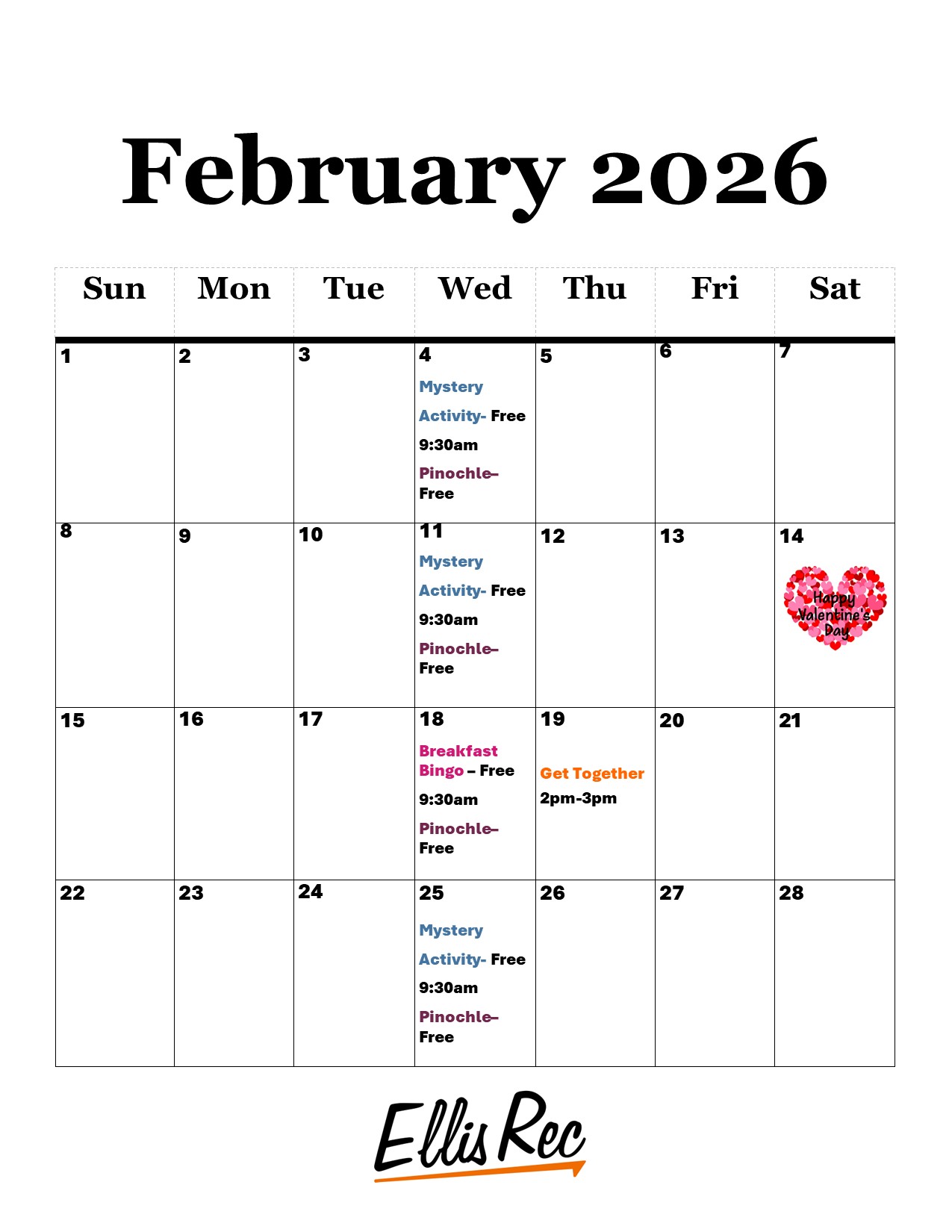 Mystery Activity: Join us at the Ellis Recreation for various games. You never know what activity will be happening. Will it be Golf (cards), Chicken Foot Dominoes, or SkipBo? Play against your friends or make some new ones!